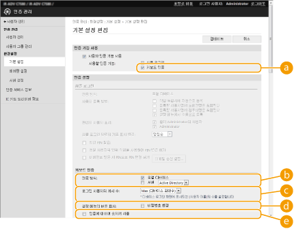 [디바이스에서의 조작 시작 시 로그인 화면을 표시함] 확인란이 선택되면: <인증 사용자 이외의 작업 조작 제한>의