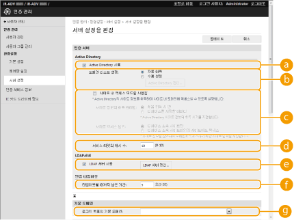 1 | [LDAP 서버 사용] 확인란을 선택하고 [LDAP 서버 관리...] [확인]을 클릭합니다. |
