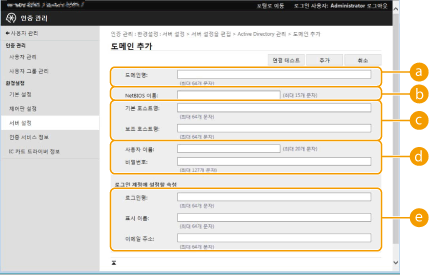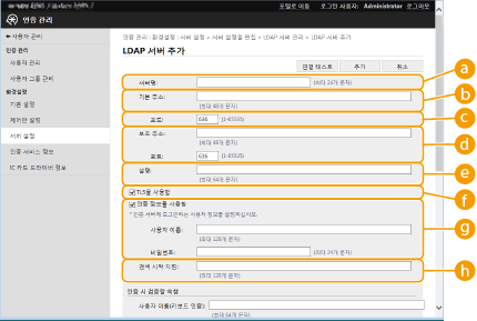 ![]() | 추가 인증 장치로 Active Directory 또는 LDAP 서버를 지정하려면, 인증에 사용되는 서버의 정보를 먼저 등록해야 합니다. 필요시 연결 테스트를 수행하십시오. |