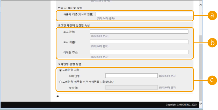 4 | 속성 이름과 도메인 이름의 설정 방법을 지정합니다. ![]() [사용자 이름(키보드 인증):]LDAP 서버의 사용자 이름에 대한 LDAP 데이터 필드(속성 이름)를 지정합니다(예: uid). [로그인명:] / [표시 이름] / [이메일 주소]LDAP 서버에 있는 각 사용자 계정의 로그인 이름, 표시 이름, 이메일 주소에 대한 LDAP 데이터 필드(속성 이름)를 지정합니다(예: uid, cn, mail). [도메인명 지정] / [도메인명 취득을 위한 속성명을 지정합니다]로그인 수신인의 도메인 이름 설정 방법을 선택합니다. 도메인 이름을 직접 지정하려면 [도메인명 지정]을 선택하고 도메인 이름*을 입력합니다. LDAP 서버의 도메인 이름을 획득할 LDAP 데이터 필드(속성 이름)를 지정하려면 [도메인명 취득을 위한 속성명을 지정합니다]을 선택하고 속성 이름을 입력합니다(예: dc). |