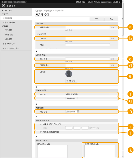 dc | 아니오 | 0 ~ 32문자 | 제어 문자 | - (해당 없음) | 변경할 수 없습니다. 다음 사용자에게 자동으로 할당됩니다. 서버 인증 후 등록된 사용자 사진 로그인에서 <작업 투입시에 자동으로 등록>을 통해 등록된 사용자 |