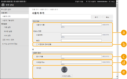 "관리자"가 기본 관리자 이름(사용자 이름)으로 등록됩니다. 이 사용자를 삭제할 수 없지만 "관리자" 권한을 가진 사용자를 추가한 후 비활성화할 수 있습니다.