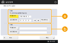 2 | 필요한 설정을 수행합니다. 환경에 따라 DNS 서버의 IP 주소를 입력합니다. ![]() <IPv4><주 DNS서버>를 누른 후, DNS 서버의 IPv4 주소를 입력합니다. 2차 DNS 서버가 있다면 IP 주소를 입력합니다. 2차 DNS 서버를 설정하지 않는 경우 "0.0.0.0"을 입력합니다. <IPv6><주 DNS서버>을 누른 후 DNS 서버의 IPv6 주소를 입력합니다. "ff"(멀티캐스트 주소)로 시작되는 주소, "0"만으로 구성된 주소 혹은 로컬 링크 주소는 입력할 수 없습니다. 2차 DNS 서버가 있다면 IP 주소를 입력합니다. "ff"(멀티캐스트 주소)로 시작되는 주소, "0"만으로 구성된 주소 혹은 로컬 링크 주소는 입력할 수 없습니다. 이 열은 공백으로 남길 수 있습니다. |
