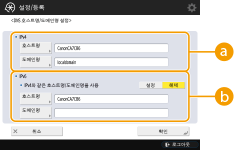 2 | 필요한 설정을 수행합니다. ![]() <IPv4><호스트명>을 누른 후, 영숫자를 사용하여 DNS 서버에 등록할 기기의 호스트 이름을 입력합니다. <도메인명>을 누른 후, 영숫자를 사용하여 기기가 속한 도메인 이름을 입력합니다(예: "example.com"). <IPv6>호스트 이름 및 도메인 이름을 IPv4와 같게 설정하려면 <IPv4와 같은 호스트명/도메인명을 사용>의 <설정>를 누릅니다. IPv4의 호스트 이름 및 도메인 이름과 다르게 설정하려면, <해제>를 누릅니다. 호스트 이름을 IPv4와 다르게 설정하려면 <호스트명>을 누르고 영숫자를 사용하여 DNS 서버에 등록할 기기의 호스트 이름을 입력합니다. 도메인 이름을 IPv4와 다르게 설정하려면 <도메인명>을 누르고 영숫자를 사용하여 기기가 속한 도메인 이름을 입력합니다. (예: "example.com"). ![]() 스테이트풀 주소 설정 (IPv6 주소 설정)에 대해 <DHCPv6 사용>을 <설정>에 설정하는 경우 수동으로 구성된 도메인 이름이 덮어쓰기 됩니다. <IPv4와 같은 호스트명/도메인명을 사용>을 <설정>에 설정하는 경우, DHCPv6 서버에서 검색된 도메인 이름이 사용됩니다. |