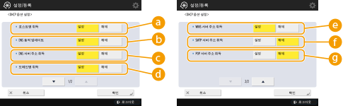 2 | 필요한 설정을 수행합니다. ![]() <IPv4 mDNS 사용>DNS 서버가 없는 환경에서 DNS 기능을 활성화하려면 <설정>을 누릅니다. <mDNS명 사용>을 누르고 영숫자 문자를 사용하여 원하는 mDNS 이름을 입력합니다. <IPv6 mDNS 사용>DNS 서버가 없는 환경에서 DNS 기능을 활성화하려면 <설정>을 누릅니다. mDNS 이름에 대한 IPv4와 같은 설정을 설정하려면 <IPv4와 동일한 mDNS명 사용>에 대해 <설정>을 누릅니다. 다른 설정을 사용하려면 <mDNS명 사용>을 누르고 영숫자 문자를 사용하여 원하는 mDNS 이름을 입력합니다. ![]() <IPv4 mDNS 사용>을 <설정>으로 설정하는 경우 기기가 완전히 슬립 모드로 진입하지 않습니다. <IPv6 mDNS 사용>을 <설정>으로 설정하는 경우 기기가 완전히 슬립 모드로 진입하지 않습니다. |