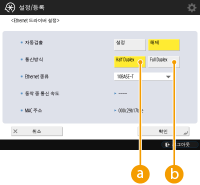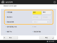 3 | 이더넷 유형을 선택합니다. <10BASE-T>, <100BASE-TX> 혹은 <Ethernet 종류>의 <1000BASE-T>을 선택합니다. |