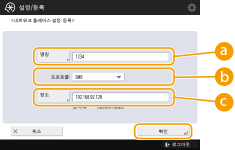 2 | 사용하는 프로토콜의 <설정>을 누른 후 <확인>를 누릅니다. ![]() SMB를 통한 연결을 사용하지 않으면 <SMB> 설정을 <해제>로 설정합니다. WebDAV를 통한 연결을 사용하지 않으면 <WebDAV> 설정을 <해제>로 설정합니다. |