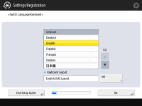 설정 가이드를 사용하지 않는 경우, 1단계에서 <설정 가이드 종료>를 누릅니다. (설정/등록)을 눌러 설정 가이드 중에 구성한 설정을 나중에 개별적으로 지정할 수 있습니다(<토너 교반> 제외). |