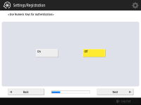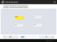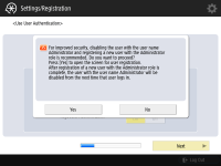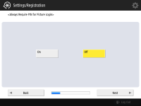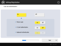 기기 보안을 강화하려면 사용자 인증을 사용하는 시스템에서 기기를 사용합니다. ![]() 이 기기는 사용자 인증을 로그인 서비스로 사용하는 것으로 설정되어 있습니다. 자세한 내용은 개인 인증 관리 설정 구성하기을 참조하십시오. ![]() <사용자 인증 사용>을 <설정>으로 누르고, 사용할 로그인 방법으로 <설정>을 누른 다음, <다음화면>을 누릅니다. 사용자 인증을 사용하지 않는다면, <사용자 인증 사용>를 위해 <해제>를 누르고 <확인>를 누른 후 6단계로 가십시오. ![]() 기기에 등록된 "관리자" 사용자 외에 관리자가 없는 경우 다음 설정을 지정합니다. ![]() "관리자" 사용자를 비활성화하고 새로운 관리자를 등록하여 보안을 강화하려면 <예>를 누릅니다. <관리자 등록>에 <사용자명>과 <비밀번호>를 입력하고 <확인>을 누릅니다. 필요에 따라 <이메일 주소>, <부문 ID>, <표시명>을 지정합니다. 자세한 내용은 로컬 장치에 사용자 정보 등록하기을(를) 참조하십시오. 다음에 로그인하면 "관리자" 사용자가 비활성화됩니다. "관리자"로 작동하려면 <아니오>를 누릅니다. ![]() ![]() 로그인 화면 표시 타이밍을 선택합니다. <기능 선택시에 표시>를 선택한 경우 <기능>을 누르고 로그인 화면을 표시할 기능을 선택한 뒤 <양호>을 누릅니다. 또한 로그인 화면을 표시할 <설정/등록> 화면에서 설정 항목을 선택합니다. <심플 로그인> 및 <키보드 인증>에 <해제>를 선택한 경우 <확인>을 누릅니다. 6단계를 진행합니다. <심플 로그인> 또는 <키보드 인증>에 <설정>을 선택한 경우 <다음화면>을 누릅니다. ![]() ![]() 로그인 화면에서만 숫자키 입력을 통해 인증을 사용하려면 <설정>을 누릅니다. <심플 로그인>에 <해제>를 선택한 경우 확인>을 누릅니다. 6단계를 진행합니다. <심플 로그인>에 <설정>을 선택한 경우 <다음화면>을 누릅니다. ![]() ![]() 그림 로그인으로 PIN 입력을 강제하려면 <설정>을 누르거나 입력을 강제하지 않으려면 <해제>를 누르고 <다음화면>을 누릅니다. ![]() ![]() 사진 로그인을 사용하며 인쇄에 적합한 설정 구성을 원하는 경우 <설정>을 누릅니다. 인쇄 강제 보류가 활성화되고 사용자 등록은 컴퓨터에서 인쇄 데이터를 사용하도록 설정되며 사용자의 인쇄에 적합한 로그인 화면이 기본으로 표시됩니다. 자세한 내용은 인쇄 강제 보류 설정 구성하기, <사용자 등록 방법>, <심플 로그인 화면의 기본 표시 변경>을(를) 참조하십시오. ![]() ![]() 그림 로그인 화면의 사전 설정 버튼의 수를 선택하고 <확인>를 누릅니다. | |