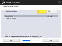 네트워크 연결 설정을 지정합니다. ![]() ![]() <IPv4 사용> 혹은 <IPv6 사용>를 위해 <설정>를 누른 후 <다음화면>를 누릅니다. IPv4와 Pv6을 모두 사용할 수 있습니다. <IPv4 사용> 및 <IPv6 사용>을<해제> 으로 누르고, <확인>를 누를 경우, 네트워크 설정을 건너뛰고 10단계로 갑니다. ![]() <IPv4 사용>를 위해 <설정>누르는 경우 다음 설정을 지정하십시오. ![]() IP 주소를 자동으로 획득하려면, <DHCP> 혹은 <자동 IP>를 누른 후 <다음화면> 또는 <확인>를 누르십시오. IP 주소를 수동으로 설정하려면 <DHCP> 또는 <자동 IP>에 대한 선택을 해제하고, <IP주소>, <서브넷 마스크> 및 <게이트웨이 주소>를 눌러 각 값을 입력한 후 <다음화면> 또는 <확인>을 누릅니다. IPV4 주소 설정에 대한 정보는 IPv4 주소 설정을 참조하십시오. ![]() <IPv6 사용>를 위해 <설정>누르는 경우 다음 설정을 지정하십시오. ![]() 스테이트리스 주소를 사용하려면 <설정>를 누르거나 스테이트리스 주소를 사용하지 않으려면 <해제>를 누른 후, <다음화면>를 누릅니다. IPv6 주소에 대한 정보는 IPv6 주소 설정를 참조하십시오. ![]() 스테이트리스 주소를 지정한 후 다음 설정을 지정합니다. ![]() 수동 주소를 사용하려면 <설정>를 누르거나 수동 주소를 사용하지 않으려면 <해제>를 누른 후, <다음화면>를 누릅니다. 수동 주소를 사용하려면 <수동 주소>, <프리픽스 길이>를 누른 뒤 <기본 라우터 주소>를 눌러 각 값을 입력합니다. ![]() 수동 주소를 지정한 후 다음 설정을 지정합니다. ![]() DHCPv6를 사용하려면 <설정>를 누르거나 DHCPv6를 사용하지 않으려면 <해제>를 누른 후, <확인>를 누릅니다. | |
