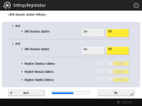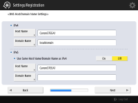 DNS 서버 주소, DNS 호스트 이름, DNS 도메인 이름을 지정합니다. ![]() ![]() <주 DNS서버>와 <보조 DNS서버>를 누르고, DNS 서버에 대한 IPV4/IPv6 주소를 입력한 후 <다음화면>를 누릅니다. DNS 서버 주소 설정에 대한 정보는 DNS 설정 구성을 참조하십시오. ![]() ![]() 기기 이름(호스트 이름)을 입력하려면 <호스트명>를 누릅니다. <도메인명>를 눌러 기기가 속한 도메인 이름을 입력한 후, <다음화면>를 누릅니다. IPv4 및 IPv6 설정이 같은 경우, <IPv4와 같은 호스트명/도메인명을 사용>를 위해 <설정>를 누릅니다. ![]() ![]() DNS 동적 업데이트 설정을 사용하여 자동으로 업데이트하려면 <DNS 동적 업데이트>를 위해 <설정>를 누른 후, <확인>를 누릅니다. <IPv6>를 위한 <DNS 동적 업데이트>를 <설정>에 설정하려면, 자동으로 등록할 항목을 위해 <설정>를 선택하십시오. | |