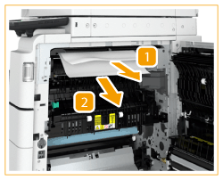 ![]() | 정착부 하단 부분에 용지가 걸렸으면 화살표 방향으로 부드럽게 당겨 빼내십시오. |