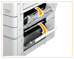 | 용지 카세트의 상단 오른쪽 커버와 하단 오른쪽 커버를 여십시오. |
