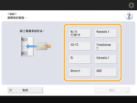 2 | 選擇信封類型。 ![]() 若要註冊自訂尺寸信封,請按下 <自訂尺寸> <下一步>,接著按下 <X> 或 <Y> 指定頁邊,然後使用數字鍵輸入指定頁邊的長度。按 <確定> 並繼續進行步驟 5。 |