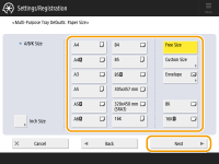 1 | Press <Custom Size>. ![]() You can specify the paper size as <Free Size>, which eliminates the need to enter the paper size setting. Specify <Free Size> when you load paper of unknown size to use for copying or when the paper size is already registered in the printer driver. |