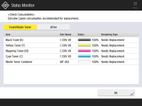 <Remaining Days> displays the expected number of days remaining until replacement is required, based on past usage. Even if <Needs Replacement> is displayed in <Remaining Days>, do not perform replacement until a message prompting you to replace consumables is displayed in the status display area (at the bottom of the touch panel display). The measurement for <Remaining Days> does not complete for a while after the machine starts operation, and <1 year or more> is displayed during this time. The remaining days displayed after this time may be extremely small temporarily. |