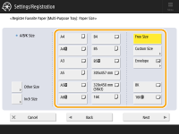 2 | Select the paper size. ![]() ![]() For information on the paper sizes displayed when <Other Size> is pressed, see Available Paper. |