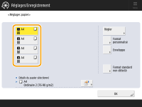 Formats de papier automatiquement détectablesSi <Personnalisé> s'affiche alors que du papier de format standard est chargé, appuyez sur <Format personnalisé>