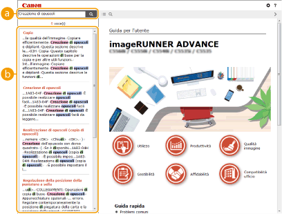 Immettere una o più parole chiave e fare clic su  per visualizzare i risultati della ricerca. È possibile effettuare la ricerca di pagine contenenti tutte le parole chiave separando queste ultime con uno spazio (vuoto). Inoltre, è possibile ricercare solo le pagine contenenti una frase esatta racchiudendo le parole chiave tra virgolette doppie.