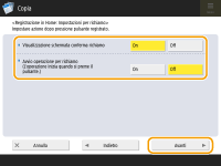 Se si seleziona <On> per <Avvio operazione per richiamo (L'operazione inizia quando si preme il pulsante.)>, la copia inizia quando si preme il pulsante registrato senza premere  (Avvio). Selezionare <Off> se si desidera avviare la copia manualmente premendo  (Avvio).