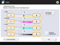 Selezionare un colore e regolarne il livello di densità in base alla relativa area di densità usando il pulsante <-> o <+>. Al termine della regolazione, premere <OK>.