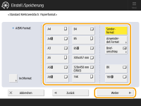 1 | Drücken Sie <Anwenderdef.Format>. ![]() Sie können das Papierformat als <Sonderformat> angeben, sodass Sie die Einstellung für das Papierformat nicht eingeben müssen. Legen Sie <Sonderformat> fest, wenn Sie Papier eines unbekannten Formats zum Kopieren einlegen oder wenn das Papierformat bereits im Druckertreiber gespeichert ist. |