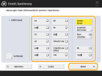 1 | Drücken Sie <Anwenderdef.Format>. ![]() Sie können das Papierformat als <Sonderformat> angeben, sodass Sie die Einstellung für das Papierformat nicht eingeben müssen. Legen Sie <Sonderformat> fest, wenn Sie Papier eines unbekannten Formats zum Kopieren einlegen oder wenn das Papierformat bereits im Druckertreiber gespeichert ist. |