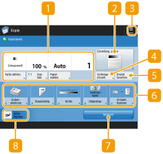 Zeigt den Einstellungsstatus, wie zum Beispiel Kopierfaktor, Papierformat und Anzahl der Kopien, an. Achten Sie darauf, die Einstellungen zu prüfen, um ordnungsgemäß kopieren zu können. Drücken Sie zur Änderung der Einstellung die Schaltfläche unterhalb des Anzeigebereichs.