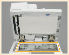 Wischen Sie die Unterseite der Zufuhr und das Vorlagenglas ab.