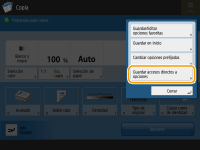 El número de opciones incluidas en la pantalla Funciones básicas y la ubicación donde aparecen varía según las funciones. No se mostrará un botón de acceso directo si <No asignado> se establece como acceso directo. El límite del número de accesos directos para <Opciones> que puede registrar es el siguiente. Copia (básica): 5 Copia (exprés): 6 Fax: 4 Leer y enviar: 2 Si ha cambiado la pantalla de Funciones básicas de copia a la pantalla de Copia exprés (Cambiar las opciones rápidamente (Pantalla de copia exprés)), seleccione el botón en el paso 3 y pulse <Guardar>. |