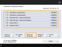 En esta pantalla, también puede consultar la información del contador para cada aplicación MEAP. Pulse <Revisar con. de MEAP> en la pantalla en el paso 2. Si pulsa <Inf. disp./otra> <Revisar conf. dispositivo> en la misma pantalla, puede consultar las opciones instaladas en el equipo y la versión del chip de seguridad relativo al cifrado de datos del disco duro.