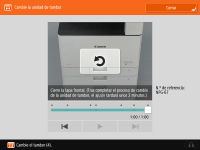 El mensaje de sustitución de la unidad de tambor que aparece en la parte inferior de la pantalla varía en función de su contrato. Pulse <Cerrar> cuando haya acabado de sustituir la unidad de tambor. |