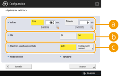 Si activa la función de Confidencialidad directa total (PFS) (<Sí>), aumenta la confidencialidad de la clave de cifrado, pero la velocidad de la comunicación es menor. Por otra parte, hay que habilitar la función PFS en el dispositivo del interlocutor de la comunicación.