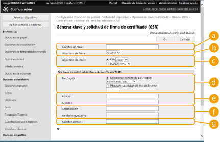 Los certificados generados en este equipo no tienen firma de CA, lo cual puede provocar errores de comunicación con algunos interlocutores. Para solicitar un certificado con firma de CA, se requieren datos de solicitud de firma del certificado (CSR). Un usuario que inicie una sesión con privilegios de administrador puede generar un CSR.