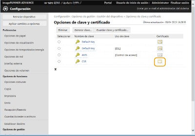 Haga clic en [Gestión del dispositivo]  [Opciones de clave y certificado].
