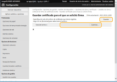 Si desea guardar los datos de CSR en un archivo, haga clic en [Guardar en archivo] y especifique la ubicación de almacenamiento.