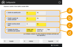 <Permitir creación de espacio personal>Para crear una carpeta exclusiva para uso personal en el Espacio avanzado, pulse <Sí>. Si <Gestión de autenticación> no está configurado como <Sí>, no se puede realizar al configuración.