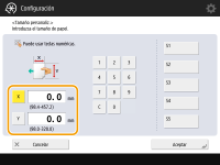 Pulse <X> o <Y> para introducir la longitud de cada cara mediante las teclas numéricas. ![]() Si registra el tamaño de papel que utiliza con más frecuencia en los botones <S1> a <S5>, puede recuperarlo con un solo toque. Registrar papel de tamaño libre (Tamaño de papel personalizado) | |