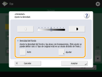 ![]() | Puede ajustar la densidad del fondo. Puede enviar con claridad originales con un fondo en color o documentos finos, como periódicos, cuyos caracteres e imágenes en el reverso son visibles en transparencia. Ajustar la densidad del fondo |