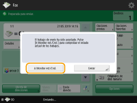Comprobar el número total de destinos especificadosEn la parte superior derecha de la pantalla se muestra el número total de destinos especificados. Esto le permite confirmar antes de proceder al envío que el número de destinos es correcto. ![]() Para enviar con la información del remitentePuede enviar con el nombre y el número de fax del remitente. <ID de terminal TX> Para consultar los estados de los documentos enviadosEn la pantalla <Status Monitor>, puede consultar los estados de los documentos enviados. En esta pantalla puede volver a enviar faxes o cancelar el envío tras consultar los estados. Comprobación del estado y el registro de los documentos enviados y recibidos Cuando <Mostrar notificación cuando se acepta el trabajo> está establecido en <On>, la pantalla <Status Monitor> puede mostrarse desde la siguiente pantalla mostrada tras la recepción de un trabajo enviado.<Mostrar notificación cuando se acepta el trabajo> ![]() Si se produce un error de transmisión porque la línea del destinatario comunicaEl equipo vuelve a marcar automáticamente tras un cierto período de tiempo. Puede cambiar la configuración relativa a cuántas veces vuelve a marcar el equipo y al intervalo entre marcaciones. <Remarcación auto> Para imprimir el informe de los resultados del envíoEn la pantalla de funciones básicas de fax, al pulsar <Opciones> <Informe de TX> puede configurar que se imprima automáticamente el informe con la lista de resultados del envío.Para establecer esto para cada trabajo en <Opciones>, es necesario seleccionar <Sólo en caso de error> o <No> en <Informe de TX> y, a continuación, configurar <Permitir impresión desde opciones> en <Sí>. Cuando se introducen múltiples hojasSe detendrá el escaneado y aparecerá el mensaje en pantalla. Siga las instrucciones para eliminar el atasco. Cuando haya eliminado el atasco, aparecerá la pantalla de reanudación de trabajo. Si el equipo detecta erróneamente alimentación múltiple de hojas, pulse <No detectar alimentación de varias hojas> para reanudar el escaneado. Para configurar de antemano que el equipo no le notifique alimentación múltiple de hojas, realice una de las siguientes operaciones. Cada vez que envíe, pulse <Opciones> en la pantalla Funciones básicas de lectura seleccione <Detectar alim. varias hojas> para deshabilitar el ajuste. Configure <Est. detección de alim. de varias hojas como prefijada> como <No> (<Est. detección de alim. de varias hojas como prefijada>). Cuando las fotos de la imagen enviada son demasiado oscuras o tienen colores claros en el fondo de color, los originales no pueden eliminarseLa calidad de la imagen enviada puede mejorarse si se cumplen las siguientes condiciones y ajustes. Tipo de trabajo: Fax (Envío desde memoria) o Leer y Enviar (Fax/I-fax) <Selección color>: <Blanco y negro> (Leer y Enviar) <Tipo de original>: <Texto> <Densidad> <Densidad del fondo>: <Auto><Resolución>: 200 ppp x 400 ppp, 300 ppp x 300 ppp*, 400 ppp x 400 ppp o 600 ppp x 600 ppp* * Puede establecerse para Leer y enviar <Priorizar calidad imagen/velocidad para lectura B/N> Trabajos de envío por fax/I-fax: <Priorizar calidad> (<Priorizar calidad imagen/velocidad para lectura B/N>)Cuando se configuran varias líneas telefónicasPara seleccionar la línea telefónica que desea utilizar para el envío de faxes, pulse <Opciones> <Seleccionar línea>. Para obtener instrucciones acerca de la especificación de las opciones de la línea de fax, consulte Opciones de línea de fax. |