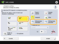1 | Seleccione <PDF> pulse <OCR (priorizar velocidad)> o <OCR (priorizar precisión)>.![]() ![]() OCR (priorizar precisión) no puede llevarse a cabo si <Trazar y suavizar> se selecciona con <OCR (priorizar precisión)>. Si se establece <OCR (priorizar precisión)> y <Compacto>, la opción <Nivel calidad imagen para Compacto> se desactiva. <Nivel calidad imagen para Compacto> Si crea un archivo PDF con las opciones <OCR (priorizar precisión)> y <Compacto> configuradas, la calidad de imagen puede variar de un archivo PDF creado con <OCR (priorizar velocidad)> y <Compacto> configuradas. Para cambiar un idioma para utilizarlo con OCR, pulse <OCR Language> seleccione un idioma pulse <Aceptar>.Solo pueden detectarse idiomas europeos con <OCR (priorizar precisión)>. Opciones e idiomas del procesamiento del OCR |