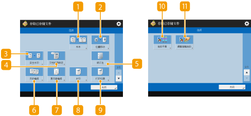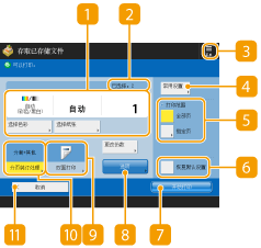 在主页屏幕上按<存取已存储文件>,然后按<存储箱>、<高级存储箱>、<网络>或<存储介质>打印文件时,会显示以下设置屏幕。