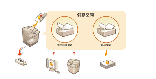 您可以將資料儲存在允許多部電腦存取的「進階郵件信箱」中,將本機當作檔案伺服器使用。例如,將掃描文件儲存在進階郵件信箱可在辦公室中達成同事間資訊共享的效果。也可將進階郵件信箱的一部份指定做為個人儲存空間,不對外公開。
