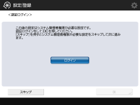 管理者権限が必要な設定を行うため、認証ログインをします。 ![]() ![]() <ログイン>を押し、管理者権限のあるユーザーを選択して操作パネルのテンキーでパスワードを入力します。お買い上げ時の「Administrator」のパスワードは「7654321」に設定されています。再度<ログイン>を押し、<OK>を押します。 お買い上げ時に設定されているパスワードを入力すると、パスワード変更の画面が表示されます。パスワードはあとから変更することもできます。管理者としてログインする 管理者権限が必要な設定を行わずに、<スキップ>を押して先に進めることもできます。その場合はStep 10へ進みます。 | |