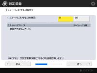 ネットワークに接続するための設定をします。 ![]() ![]() <IPv4を使用>または<IPv6を使用>の<ON>を押し、<次へ>を押します。IPv4/IPv6両方を使用することもできます。 <IPv4を使用>と<IPv6を使用>を<OFF>にして<OK>を押すと、ネットワークの設定を行わずにStep 9へ進みます。 ![]() <IPv4を使用>を<ON>にした場合は、次の設定を行います。 ![]() IPアドレスを自動で取得する場合は、<DHCP>または<Auto IP>を押し、<次へ>または<OK>を押します。 IPアドレスを手動で設定する場合は、<DHCP>または<Auto IP>の選択を解除して、<IPアドレス>、<サブネットマスク>、<ゲートウェイアドレス>を押してそれぞれ入力し、<次へ>または<OK>を押します。 IPv4アドレスの設定について詳しくは、IPv4アドレスを設定するを参照してください。 ![]() <IPv6を使用>を<ON>にした場合は、次の設定を行います。 ![]() ステートレスアドレスを使用する場合は<ON>/使用しない場合は<OFF>を押し、<次へ>を押します。 IPv6アドレスの設定について詳しくは、IPv6アドレスを設定するを参照してください。 ![]() ステートレスアドレスを設定したあと、次の設定を行います。 ![]() 手動アドレスを使用する場合は<ON>/使用しない場合は<OFF>を押し、<次へ>を押します。 手動アドレスを使用する場合は、<手動アドレス>、<プレフィックス長>、<デフォルトルーターアドレス>を押してそれぞれ入力します。 ![]() 手動アドレスを設定したあと、次の設定を行います。 ![]() DHCPv6を使用する場合は<ON>/使用しない場合は<OFF>を押し、<OK>を押します。 | |