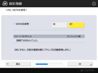 DNSサーバーアドレスやDNSのホスト名/ドメイン名などを設定します。 ![]() ![]() <プライマリーDNSサーバー>、<セカンダリーDNSサーバー>を押して、DNSサーバーのIPv4/IPv6アドレスを入力し、<次へ>を押します。 DNSサーバーアドレスの設定などについて詳細は、DNSの設定をするを参照してください。 ![]() ![]() <ホスト名>を押して本機の名称(ホスト名)を、<ドメイン名>を押して本機が属するネットワークドメイン名を入力し、<次へ>を押します。 IPv4とIPv6が同じ設定になる場合は、<IPv4と同じホスト名/ドメイン名を使用>の<ON>を押してください。 ![]() ![]() DNSの動的更新で自動登録する場合は、<DNSの動的更新>を<ON>にして、<OK>を押します。 <IPv6>の<DNSの動的更新>を<ON>にした場合は、自動登録する項目を<ON>にします。 | |
