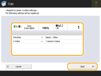 To register a Personal button, you need to log in with personal authentication management. Configuring the Personal Authentication Management Settings If you select <Device Login Authentication Information> for <Information Used for File TX/Browsing Authentication>, a password for a file destination is not stored in a Personal button. <Information Used for File TX/Browsing Authentication> For information on the maximum number of Personal buttons and Shared buttons that can be registered, see Management Functions. Personal buttons cannot be changed to Shared buttons, and vice-versa. To do so, recall the settings and register another button from <Menu>. Press and hold a button to change its name/comment or move/delete it. The same operations (changing the name/comment of a button or moving/deleting a button) can be performed from <Menu> on the <Home> screen. Customizing the <Home> Screen Personal buttons can be shared between multiple devices by synchronizing personalized data. List of Items That Can Be Personalized Settings that can be registered in Personal buttons/Shared buttonsFunctions and settings that can be registered in Personal buttons/Shared buttons are indicated below. Settings that can be registered in <Favorite Settings> for the <Copy> function Reducing Copying Operations <Fax> function settings of the machine Basic Operations for Sending Faxes Settings that can be registered in <Favorite Settings> for the <Scan and Send> function Useful Scanning Functions Settings that can be registered in <Favorite Settings> for the <Scan and Store> function Setting Screen and Operations for Scanning to Save Save locations for the <Scan and Store> and <Access Stored Files> functions Using Storage Space Shortcuts to the Basic Features screen for the <Fax/I-Fax Inbox> function Access to a server and the login password can be registered to Personal buttons/Shared buttons. This is convenient for skipping password entry when recalling the registered button. If you want to set password in the settings stored in the registered button, as you often import settings in a Personal button or Shared button to another machine and you want to prevent users from pretending to be other users, exclude a password when registering. Importing/exporting the registered buttonsYou can import and export the registered Personal/Shared buttons from the Remote UI. Importing/Exporting All Settings The Personal buttons/Shared buttons of imageRUNNER ADVANCE series devices that have the Quick Menu function can be imported/exported as Personal buttons/Shared buttons. |