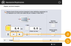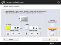 Quando si apre di nuovo la schermata <Regolaz. posizione immagine> dopo averla chiusa, premendo <OK>, i valori sulla schermata ritornano a <0>. Il valore di regolazione rimane tuttavia applicato. Se si ripetono i passaggi, leggere il valore dei segni di registro della nuova pagina e inserire il nuovo valore.