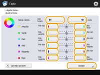 > para <Todos los colores>. Para establecer cada color por separado, utilice los botones que están a la izquierda y a la derecha de cada color. Cuando termine el ajuste, pulse <Aceptar>.
