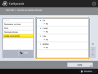 Puede seleccionar si desea evitar que los usuarios recuperen los registros para los destinos y las opciones de lectura especificadas anteriormente. Al seleccionar <Sí>, se ocultan los botones <Opciones previas> de la pantalla de funciones básicas de fax y la pantalla Funciones básicas de lectura.